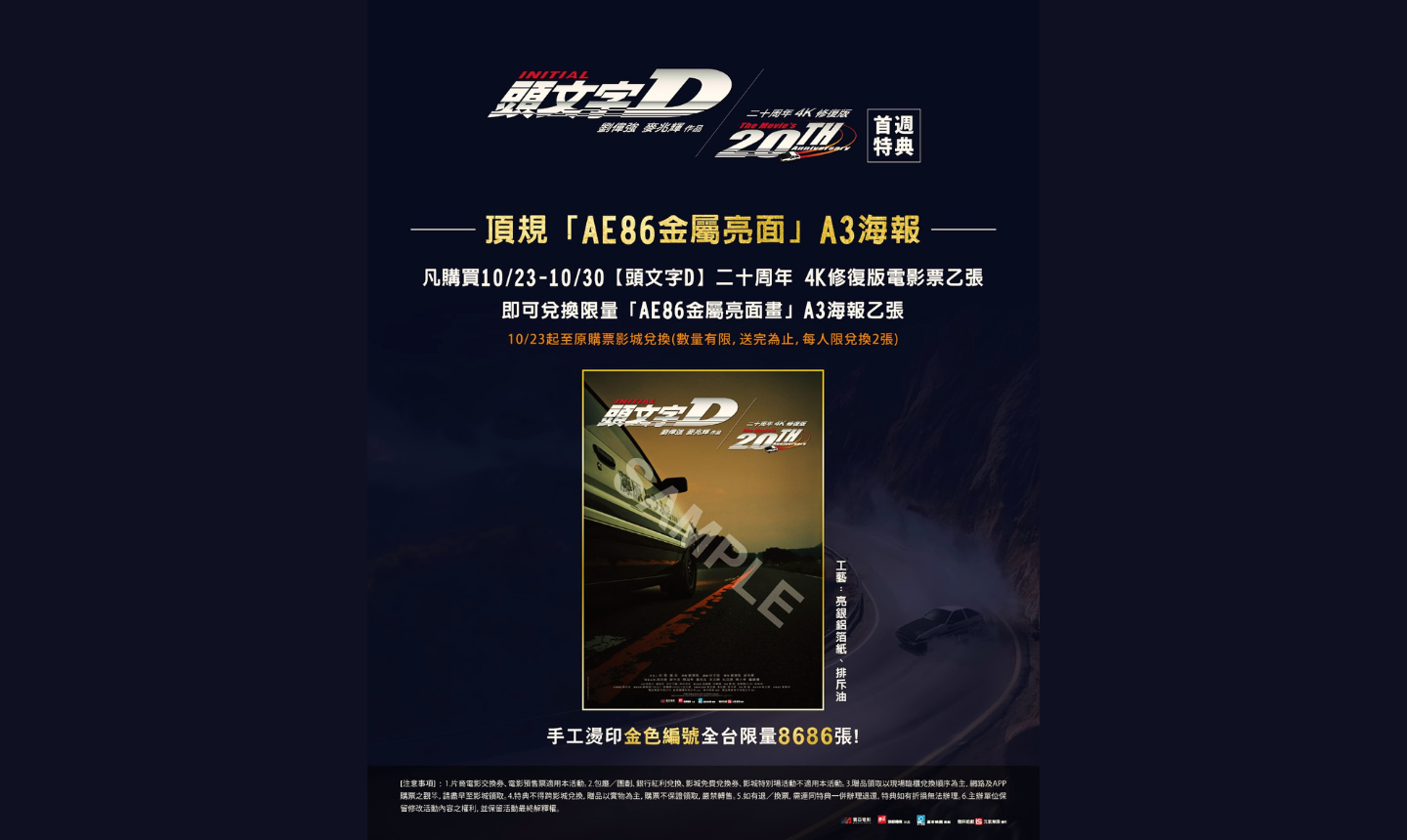 場次開放預售後,凡購買《頭文字D》10/23(五)~10/30(四)期間電影票1張,10/23(四)即可憑電影票兌換【AE86金屬亮面 A3海報】乙張。