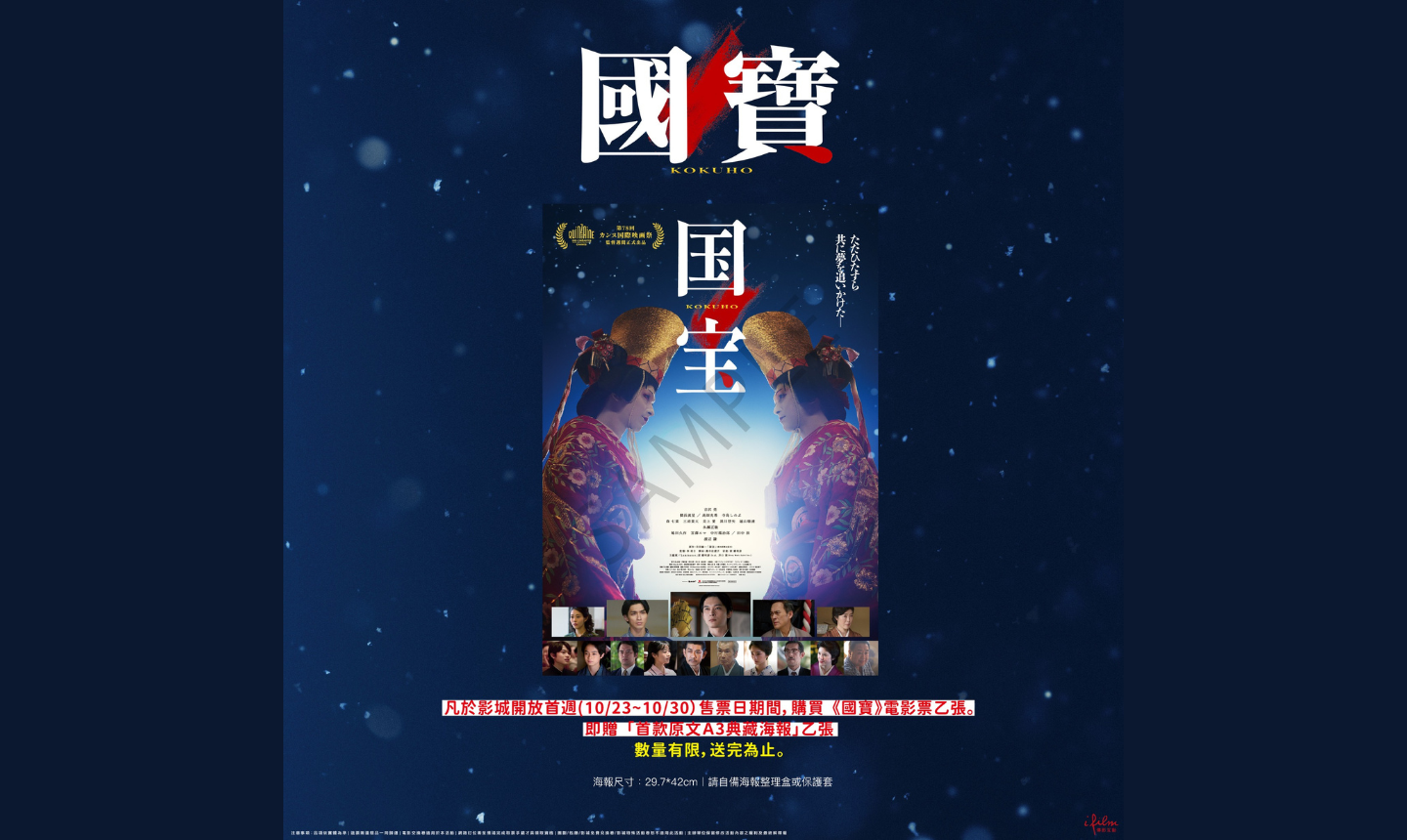 場次開放預售後,凡購買《國寶》10/24(五)~10/30(四)期間電影票1張,即可憑電影票兌換【首款原文A3典藏海報】乙張。
