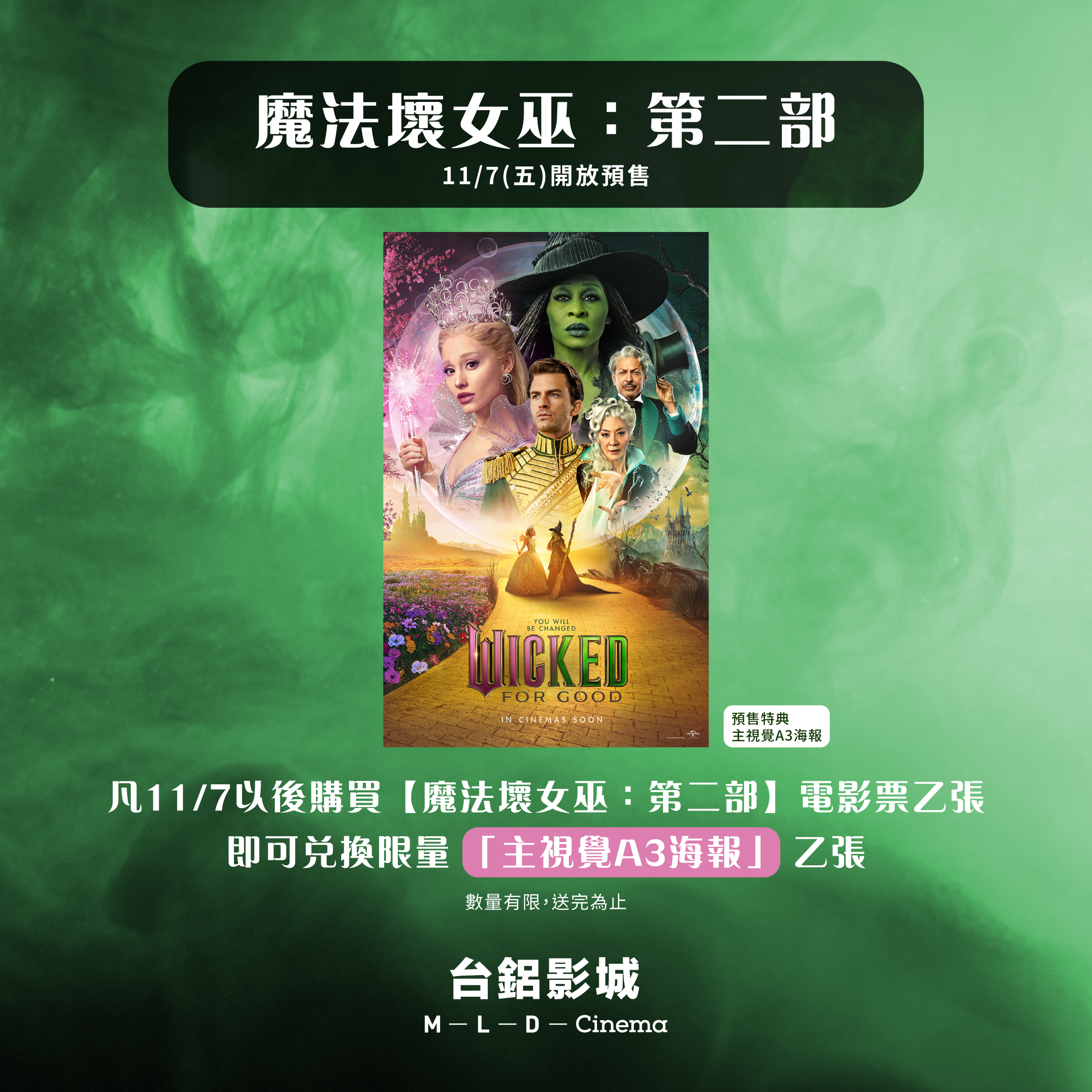 11/7(五) 15:00起開放預售場次,凡預購《魔法壞女巫:第二部》電影票1張,即可憑票兌換【《魔法壞女巫:第二部》主視覺A3海報】乙張。