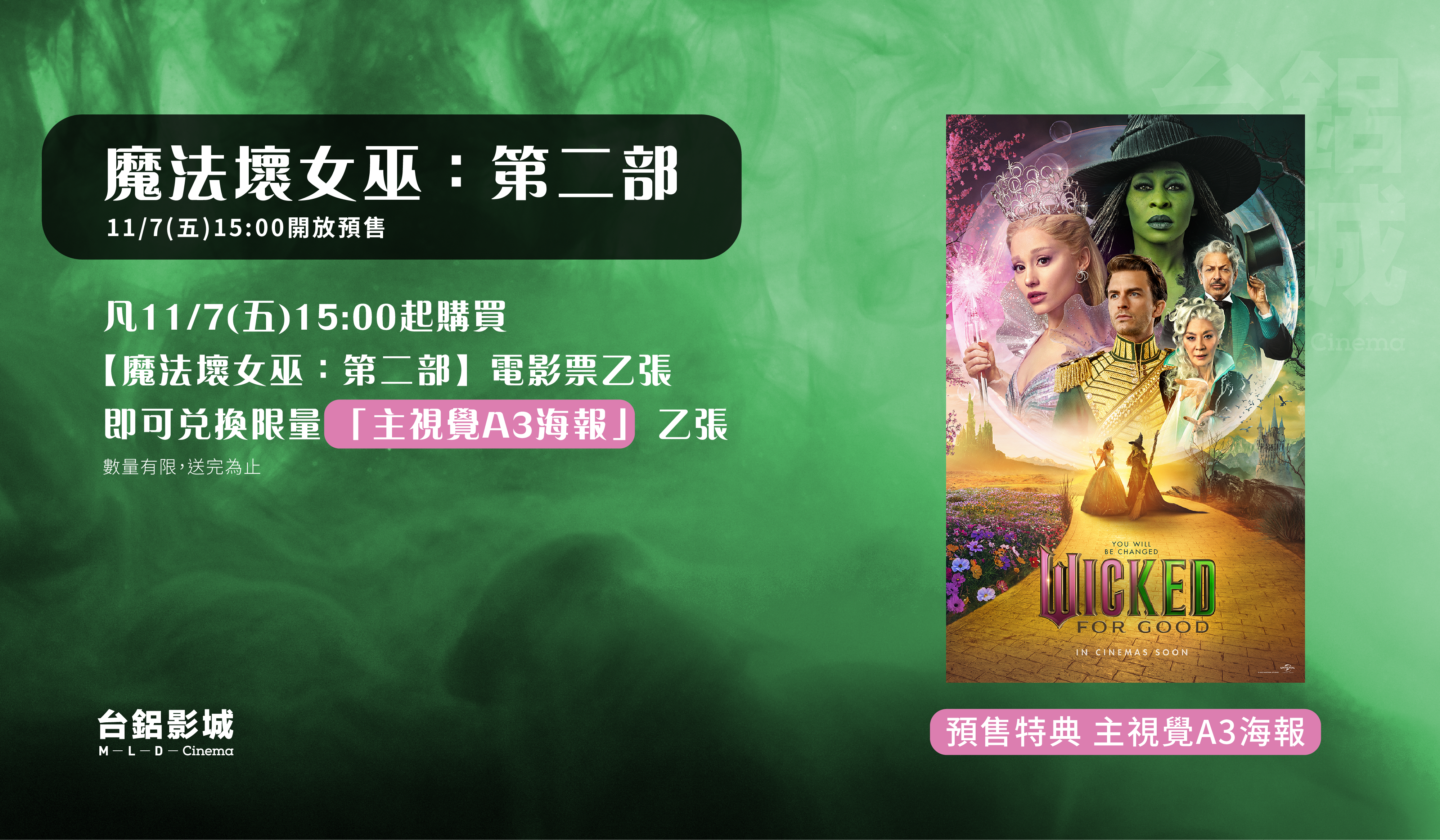 11/7(五) 15:00起開放預售場次,凡預購《魔法壞女巫:第二部》電影票1張,即可憑票兌換【《魔法壞女巫:第二部》主視覺A3海報】乙張。