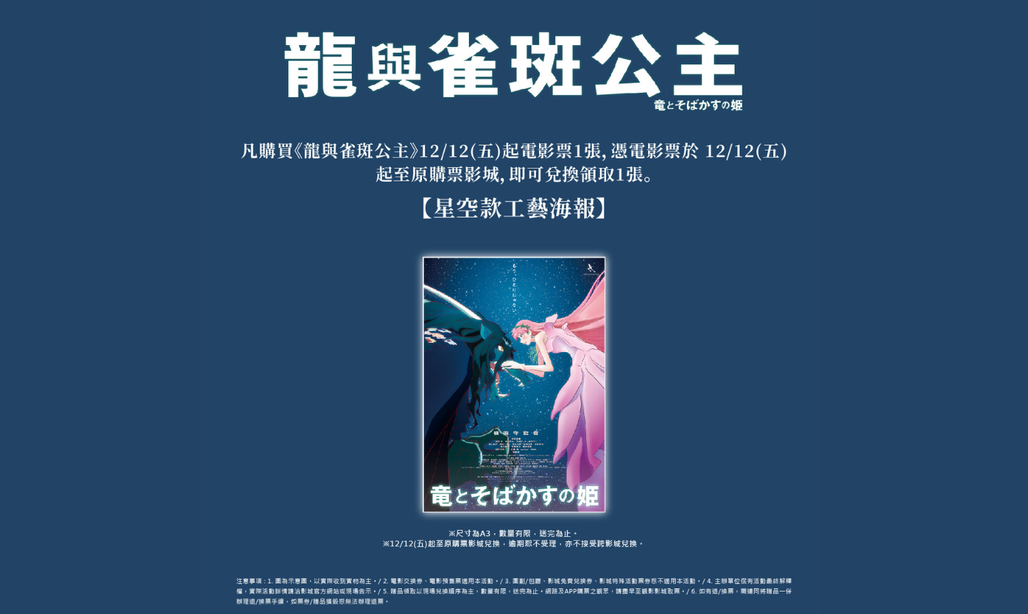 場次開放預售後,凡購買《龍與雀斑公主》12/12(五)起期間電影票1張,即可憑電影票兌換【星空款工藝海報】乙張。