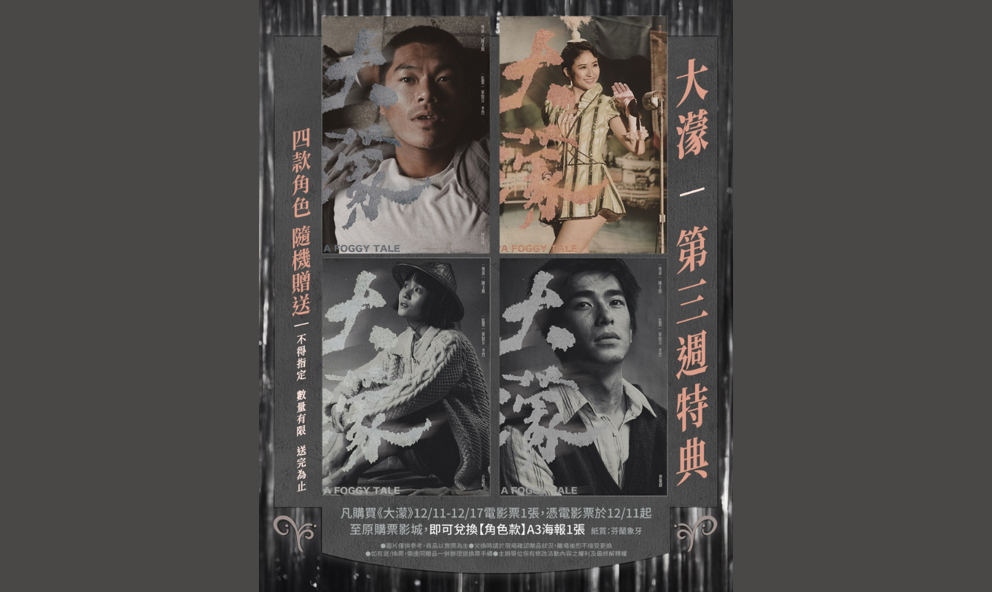 場次開放預售後,凡購買《大濛》12/11(四)~12/17(三)期間電影票1張,即可憑電影票兌換【角色海報】乙張。