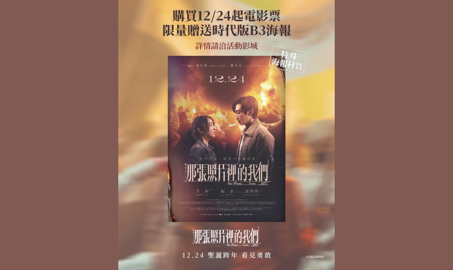 場次開放預售後,凡購買《那張照片裡的我們》12/24(三)~12/30(二)期間電影票1張,12/24(三)起即可憑電影票兌換【時代版 B3 海報】乙張。