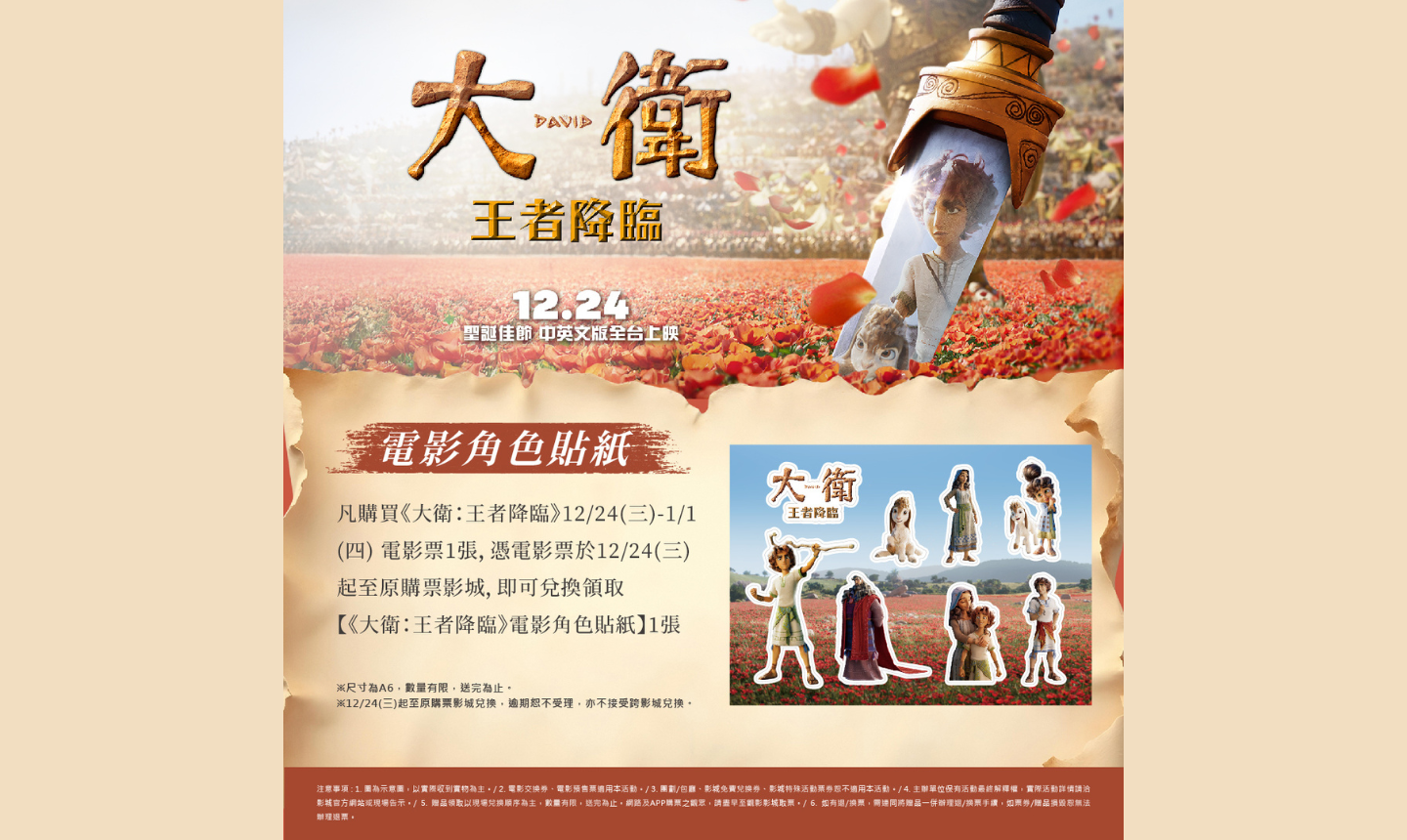 場次開放預售後,凡購買《大衛:王者降臨》12/24(三)~1/1(二)期間電影票1張,12/24(三)起即可憑電影票兌換【《大衛:王者降臨》電影角色貼紙】乙張。