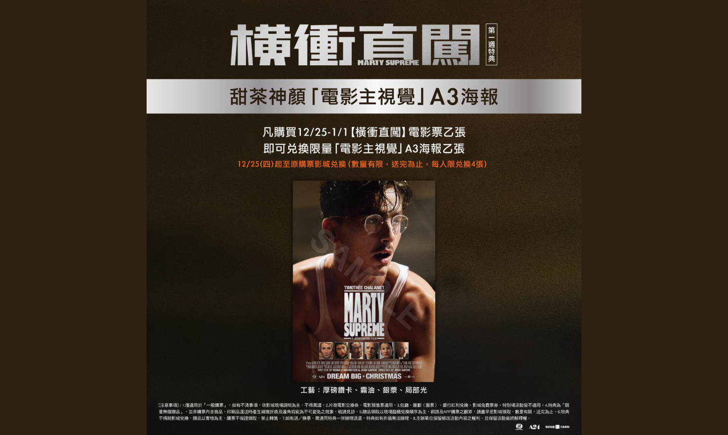 場次開放預售後,凡購買《橫衝直闖》12/25(四)~1/1(四)期間電影票1張,12/25(四)起即可憑電影票兌換【電影主視覺 A3海報】乙張。